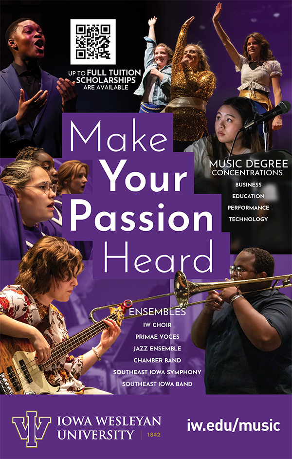 The Iowa Wesleyan Department of Music requested new promotional materials to promote the addition of new degree concentrations within the Music program. It was important to incorporate performance photography, but also show students in degree concentrations that were not performance based. The tagline was developed to speak to student creators about the Department of Music culture and community.